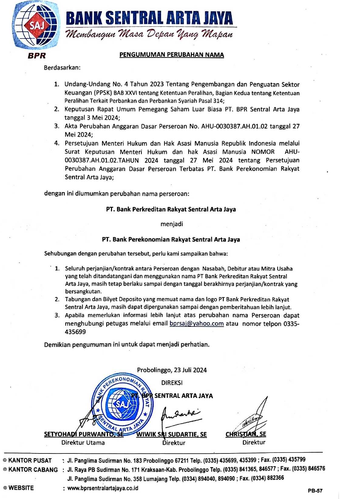 Kami beritahukan kepada seluruh nasabah PT BPR Sentral Arta jaya, bahwa Kantor Kas Maron yang